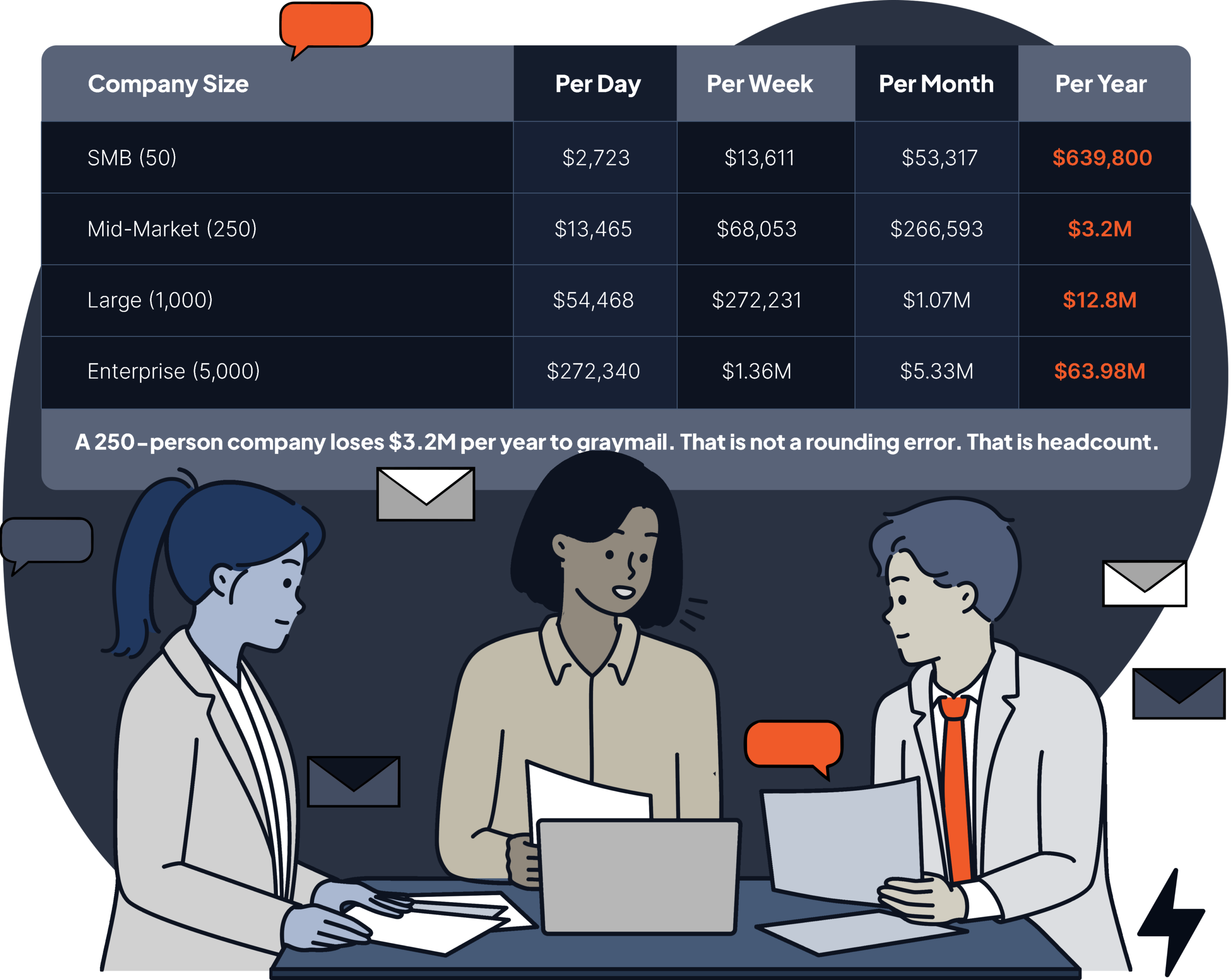 Your IT team already runs email security gateways, endpoint protection, and SIEM. Those tools stop malware, phishing, and bulk spam. They were never designed to stop graymail: the AI-written sales sequences, automated prospecting, and template outreach that passes SPF, DKIM, and DMARC cleanly, lands in primary inboxes, and costs every employee 1.5 hours a day to sort. At 500 seats, that is $6.4 million per year bleeding through the gap between your spam filter and your team’s attention.